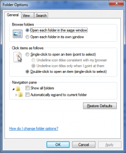 Folder Options controls the way Windows Explorer functions, settings like click once on an item to activate instead of double clicking are here along with displaying hidden folders, displaying extensions for known programs or opening folders in a new window instead of the same window and much more are located here. These options can also be accessed from Windows Explorer by pressing Alt+T(for tools) and then Folder options. There are options here as well for when you perform searches, you can specify if you’d prefer to use an index or search everything each time as well as other options like search through zip/cab files.