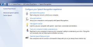 If you have a microphone you can have Windows work with your voice, there are several things you can do under this option of the control panel. This is where you can come to turn on speech recognition but before you do that you should use the Set up microphone and Train your computer to better understand you options. If you’ve never used it before you can use the Take Speech Tutorial to see what you can do which at the same time will also train your computer for your voice, the more you use it the more the computer will pick up on the way you annunciate words.