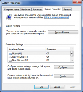 The home page for the System option of the Control Panel will display your computer name, your product ID and if it’s genuine or not along with how much RAM you have, the processor you’re running if you have a pen or touch screen connected. This area is actually quite complicated and should be avoided by novices to a degree, it will be explained in more detail through other tutorials. This area can be used to configure things like if you can connect to your computer remotely which obviously opens up security risks with it but is fairly secure especially if you know what you’re doing. It will also allow you to change a wide range of system settings through the various dialog boxes. One thing I would like to mention is that this is where you come to create a restore point should you need to do so, by clicking system protection and then the Create… button.